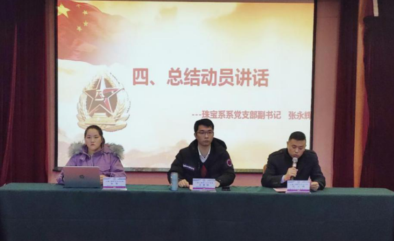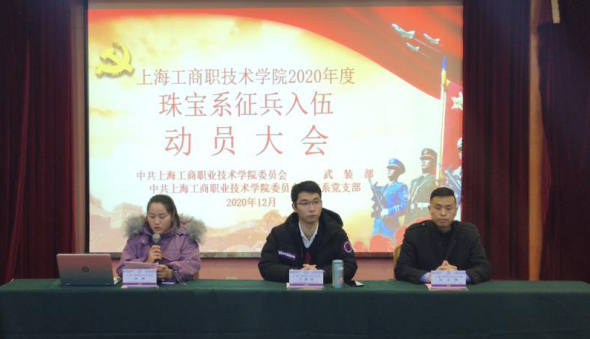 为推进大学生应征入伍工作,帮助大学生了解、掌握应征入伍相关政策和流程,鼓励学生积极应征入伍,献身国防事业,珠宝系于2020年12月16日中午在大多媒体举行征兵动员大会,出席本次大会的有学院党委武装部副部长王昊聘、珠宝系党支部副书记张永辉、珠宝系团总支书记、大一辅导员徐琪、珠宝系大二辅导员周雷及珠宝系全体同学,大会由珠宝系征兵工作站站长张聪主持。