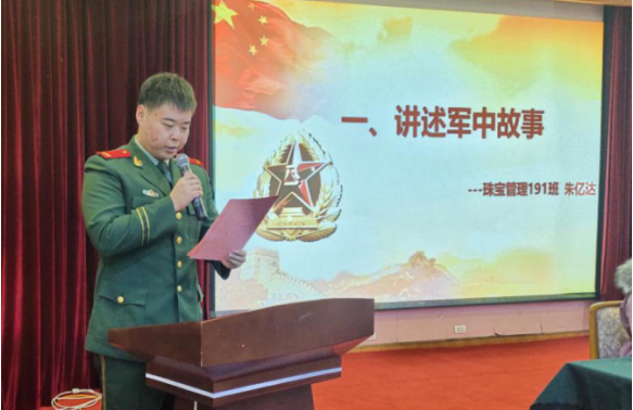 会议开始,退伍军人、珠宝管理191班朱亿达以自己的亲身经历,向同学们讲述了部队里的故事,言语之中表现出他对军旅生活无尽的怀念,因为热爱,所以选择;因为经历,所以成长。他号召同学们不能空有爱国情怀,应付诸实践,为祖国奉献青春。